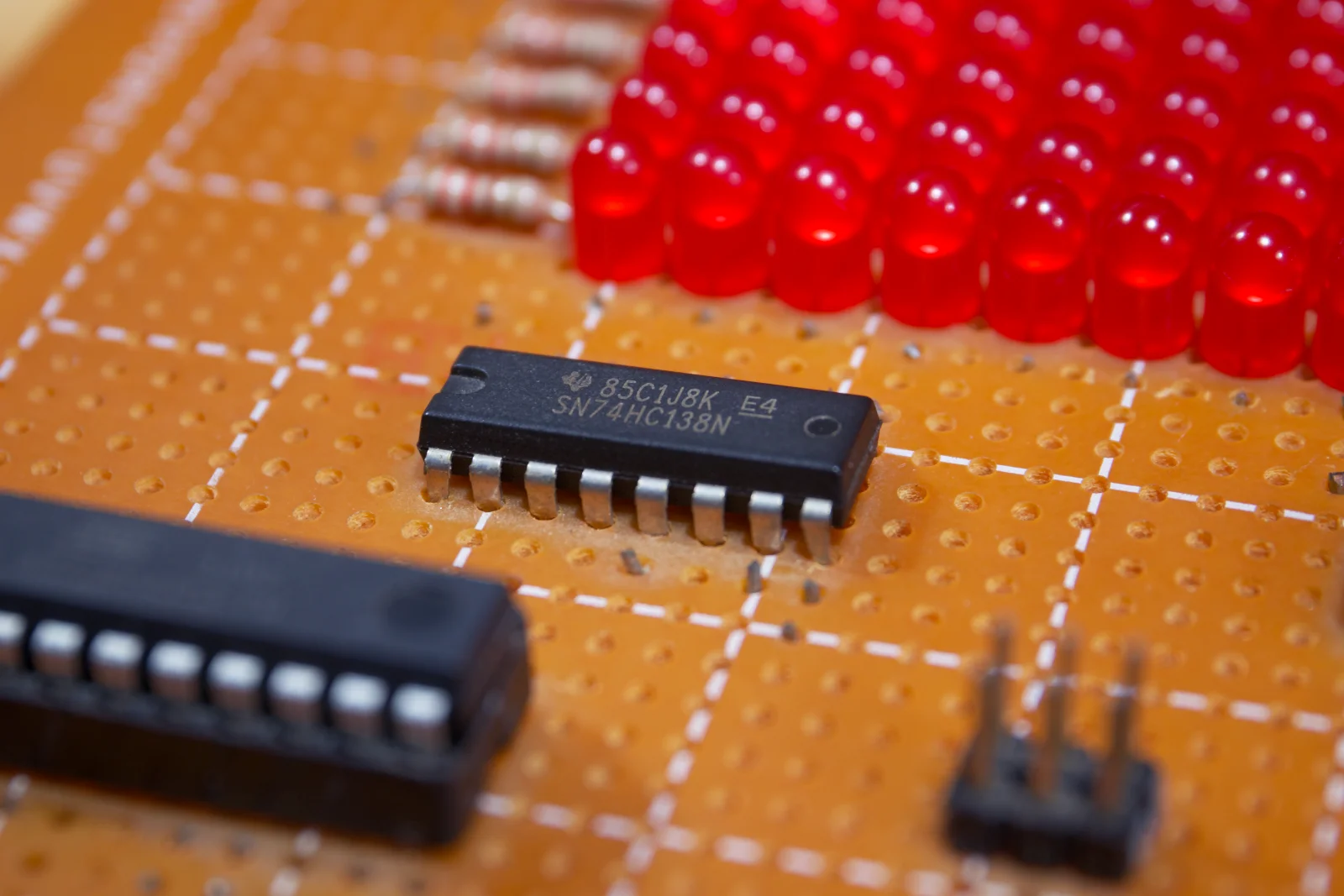 The circuit consists of an ATTiny2313 driving two 74 series decoders which together could enable one column of LEDs at a time. The AVR has one pin for each row so by scanning the columns across it was possible to drive the whole display with just these components.