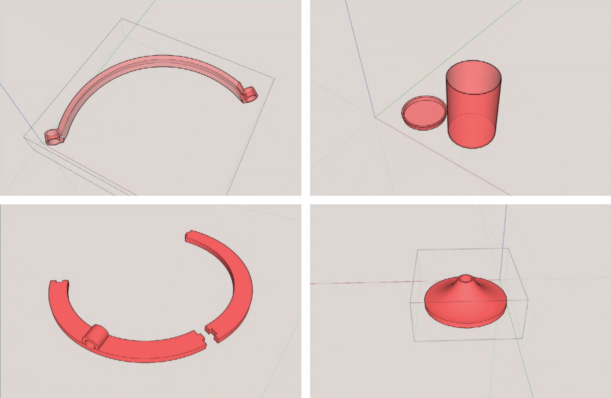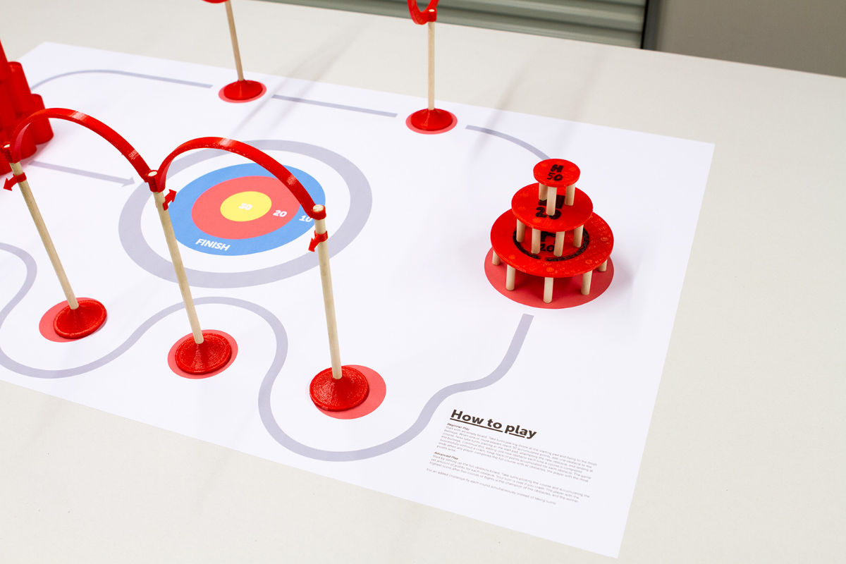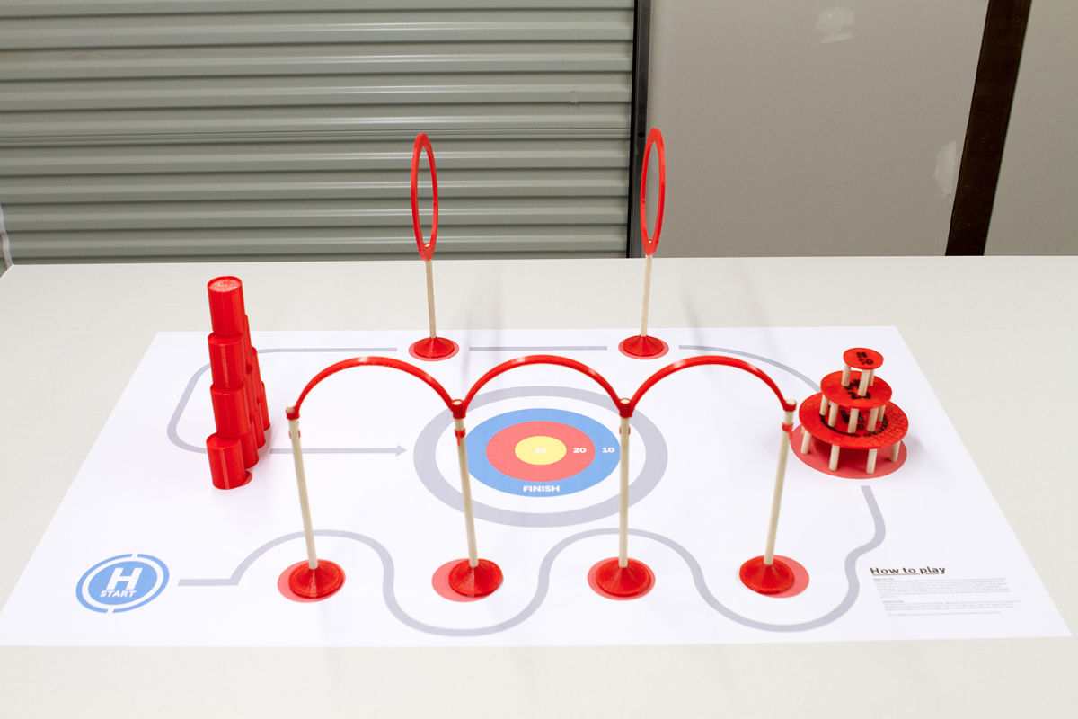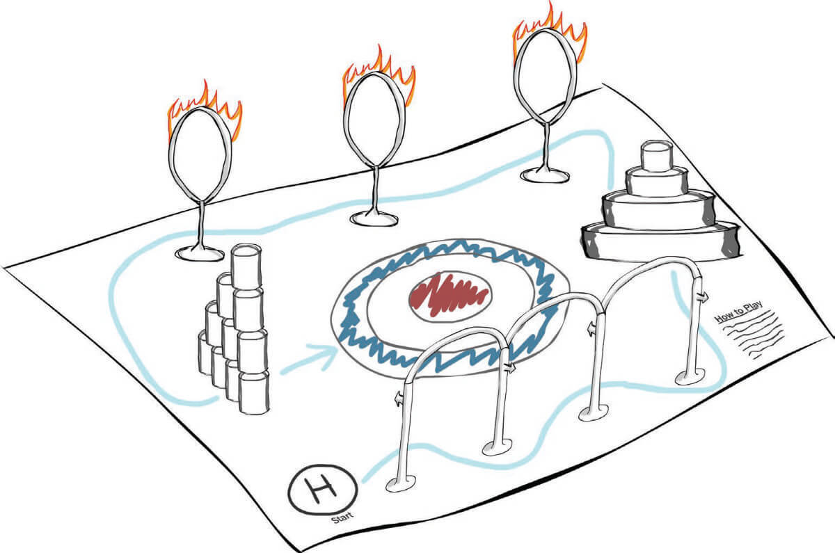 Many of the obstacles were modeled in Google Sketchup. This allowed for 3D printing of the pieces. The game board was designed in Illustrator and printed on paper using a large format printer. In production versions of the game the pieces might be injection molded and the board could be printed on a fabric material to make it easy to fold or roll and store in a game box without damaging it.